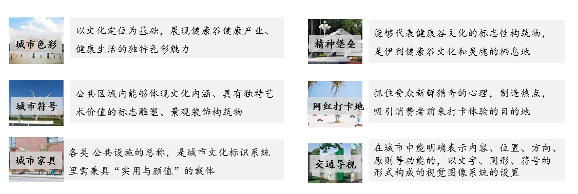 最终,健康谷形成了“创造健康,共享健康”的文化定位,从“共创健康产业”“共享健康生活”两大维度展开,以“陪伴”为暗线,通过城市色彩、精神堡垒、城市符号、网红打卡地、城市家具、交通导视等载体,将文化融入到健康谷的每一方土地、每一条街道、每一片城市空间,最终形成文化主题突出、特色鲜明、独具魅力的健康谷形象,完成了“从一棵草到一杯奶”的城市叙事。